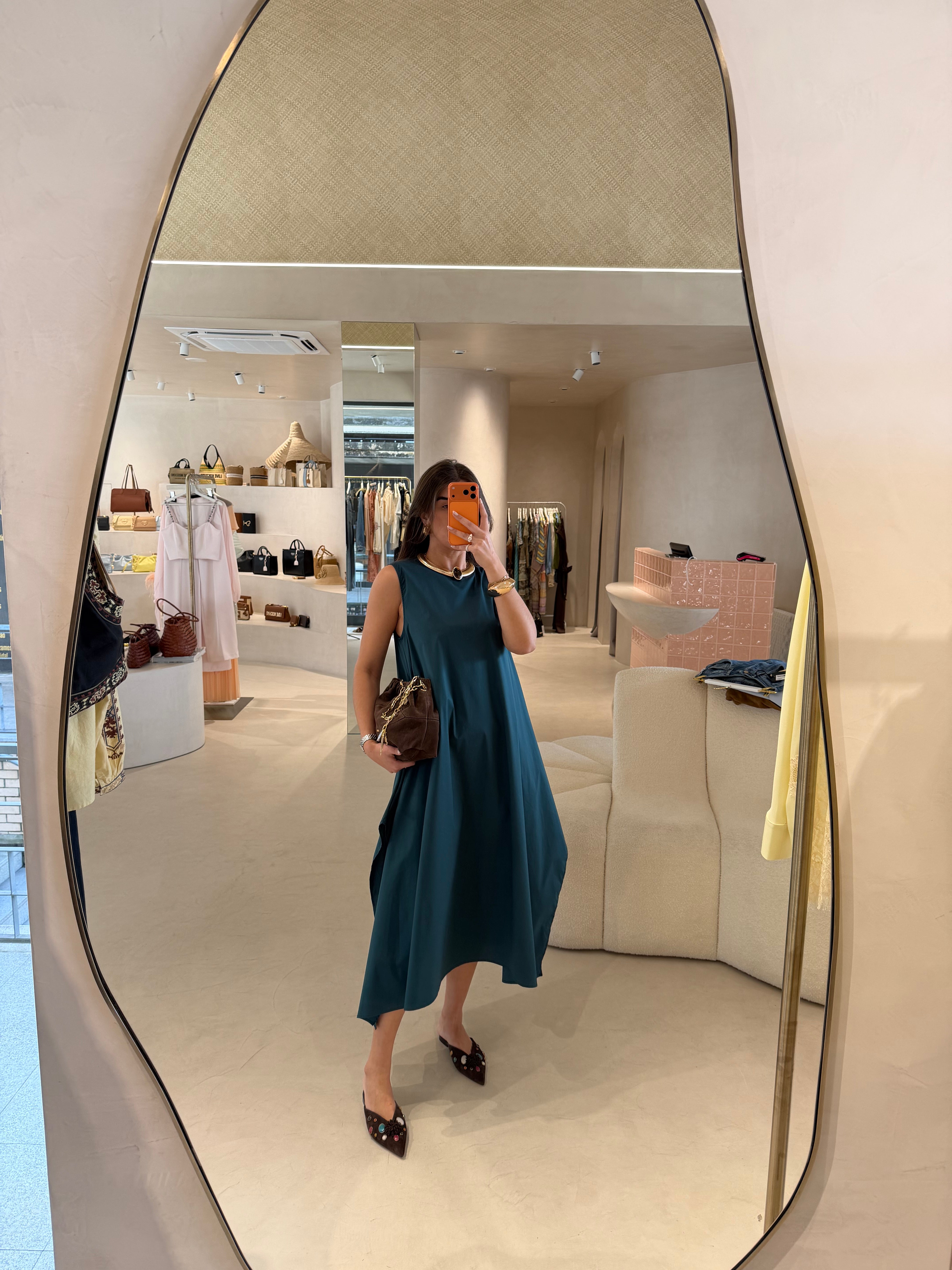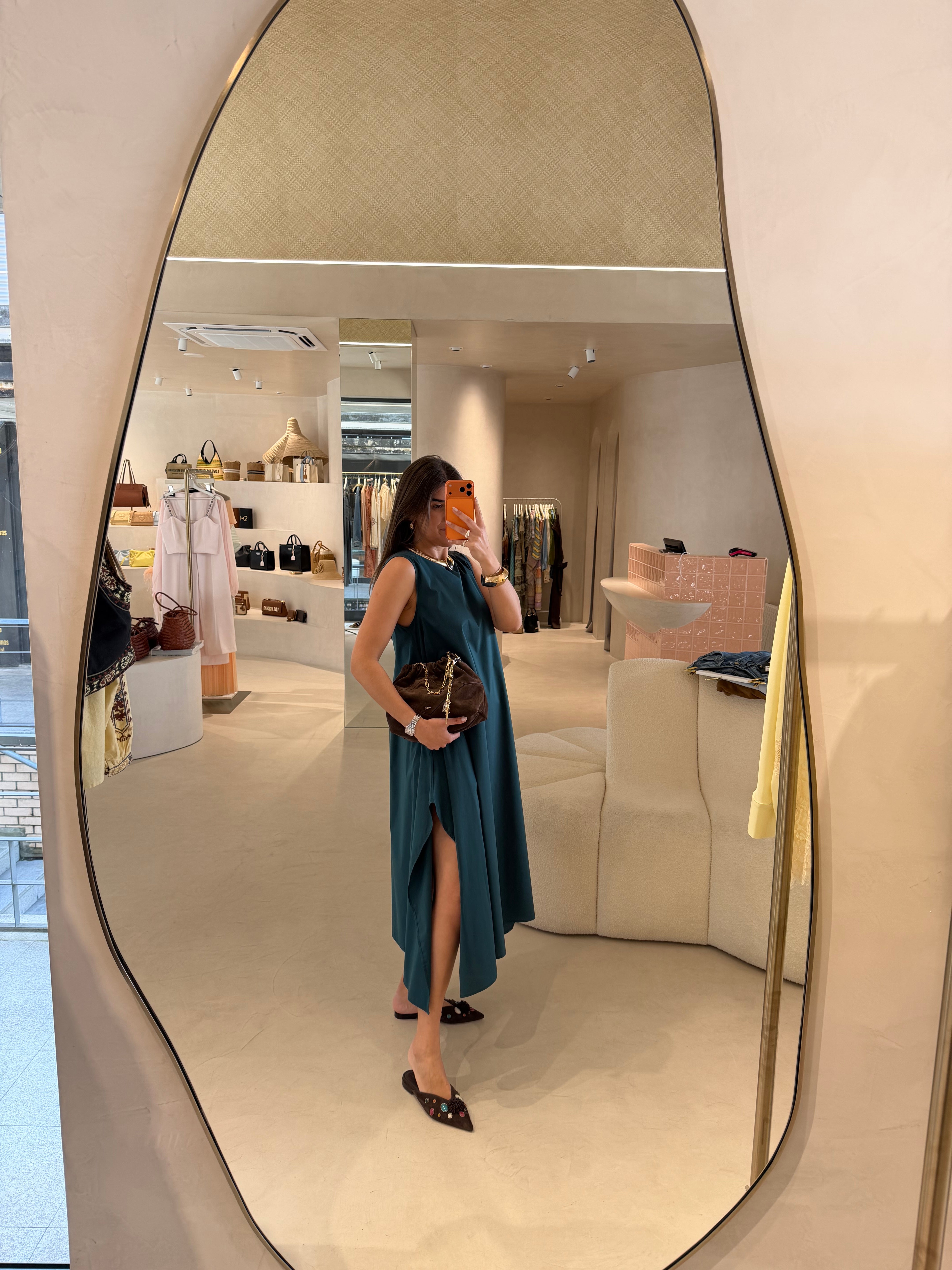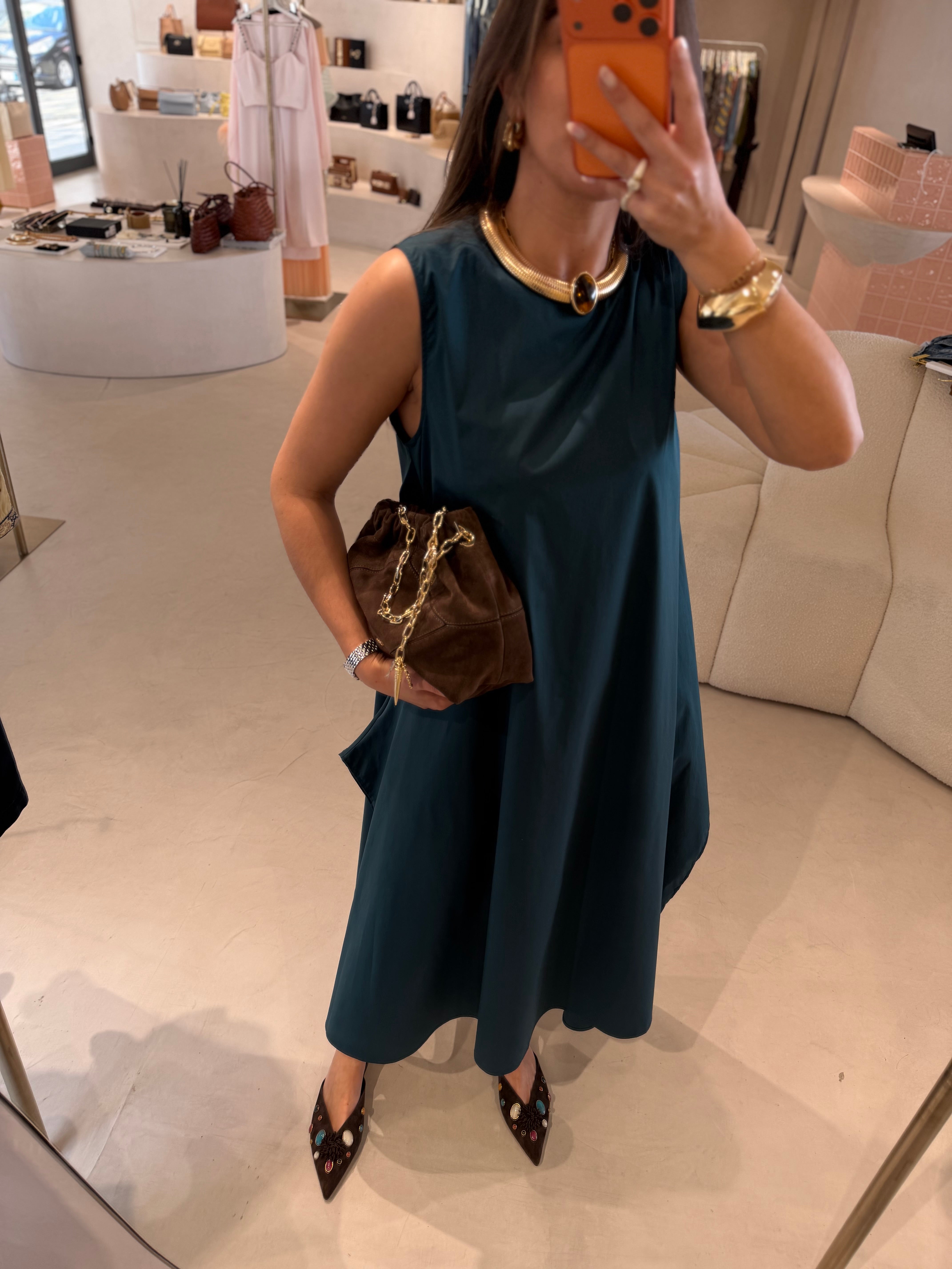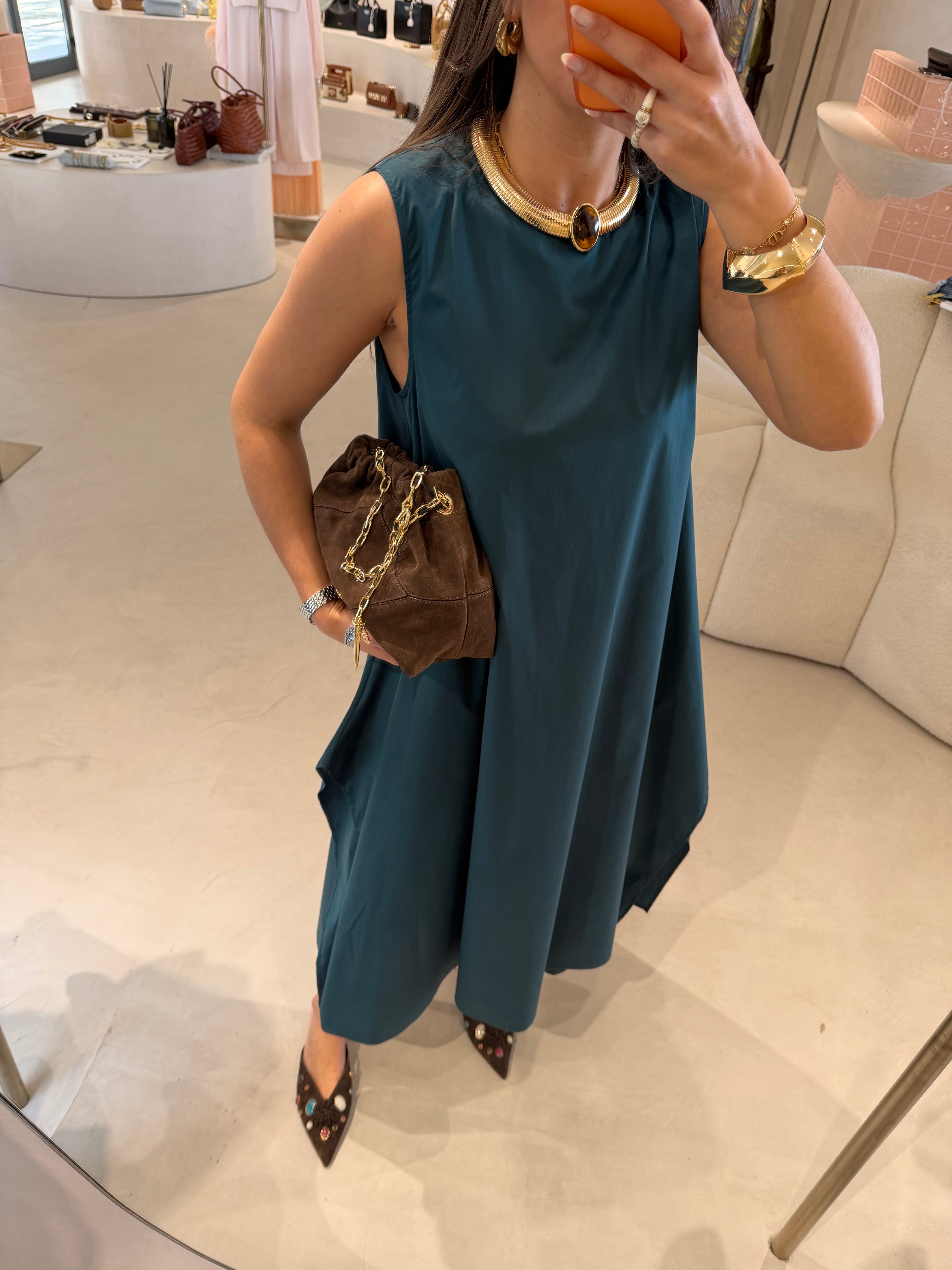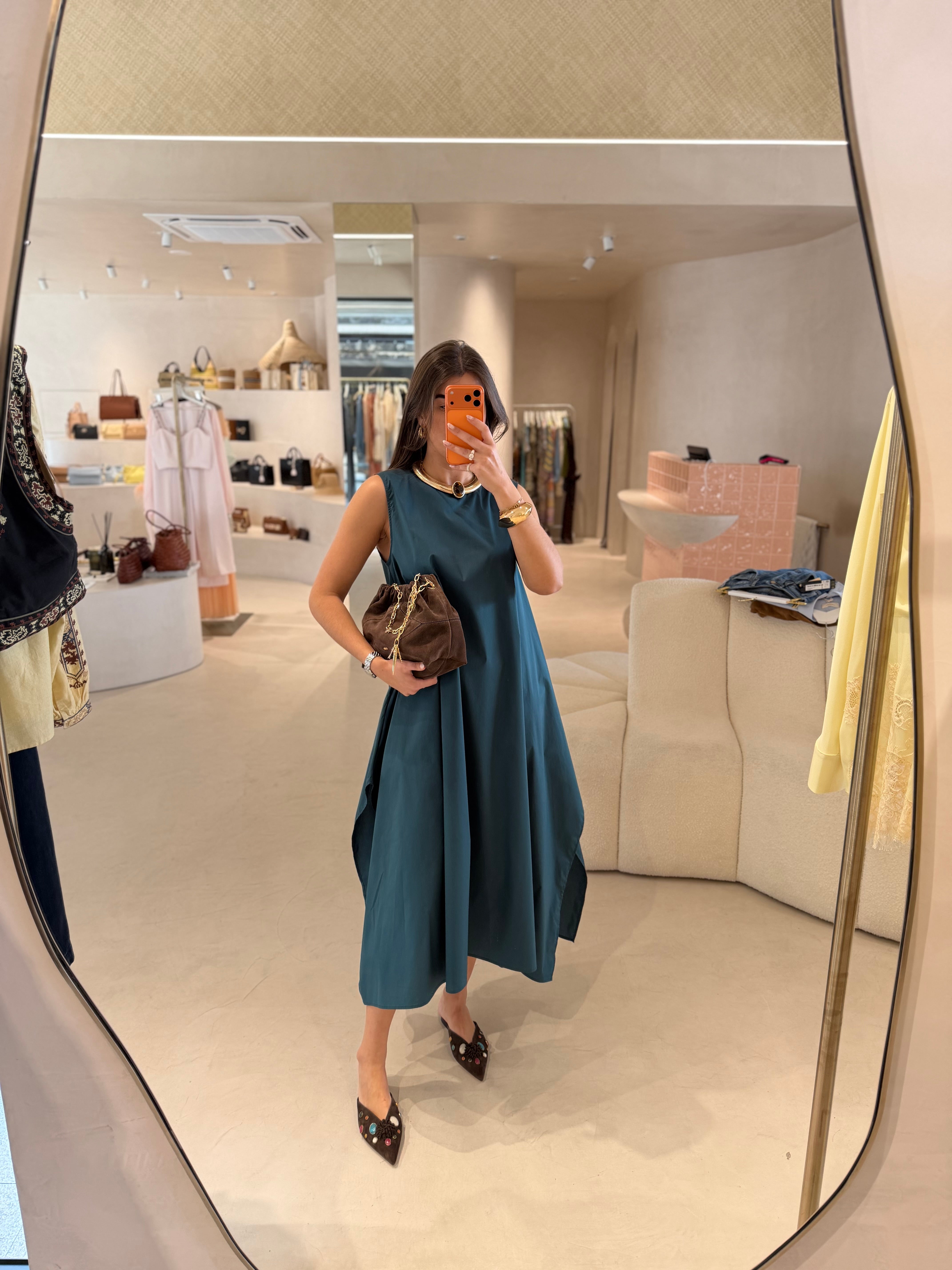Vestido em popeline de algodão com mangas cavas e corte A amplo, que une leveza e conforto a uma silhueta elegante e moderna. O tecido estruturado da popeline garante caimento perfeito, enquanto a amplitude do corte A cria movimento e fluidez, valorizando diferentes tipos de corpo de forma natural. As mangas cavas proporcionam liberdade nos ombros e braços, conferindo um toque casual e ao mesmo tempo sofisticado.