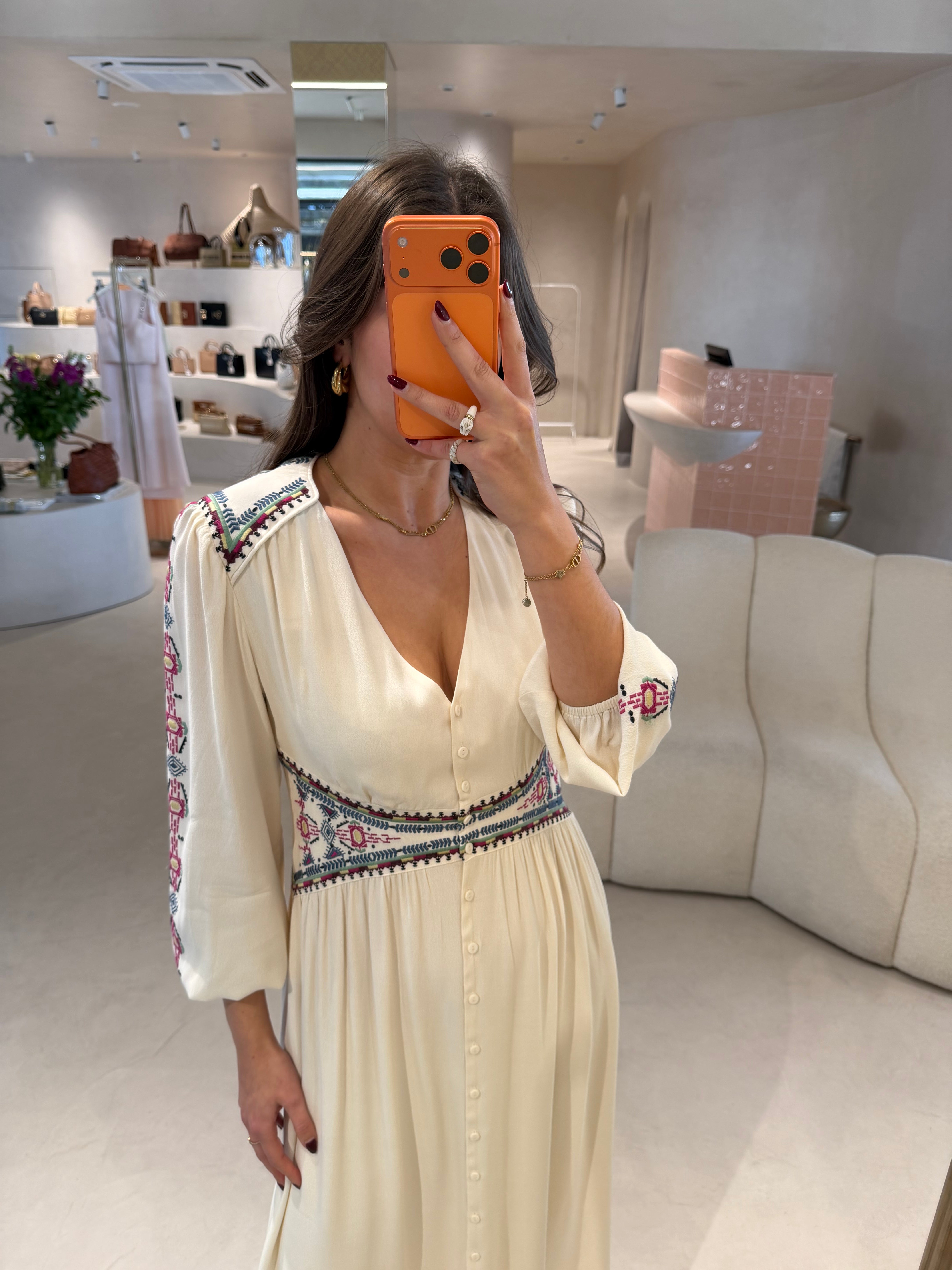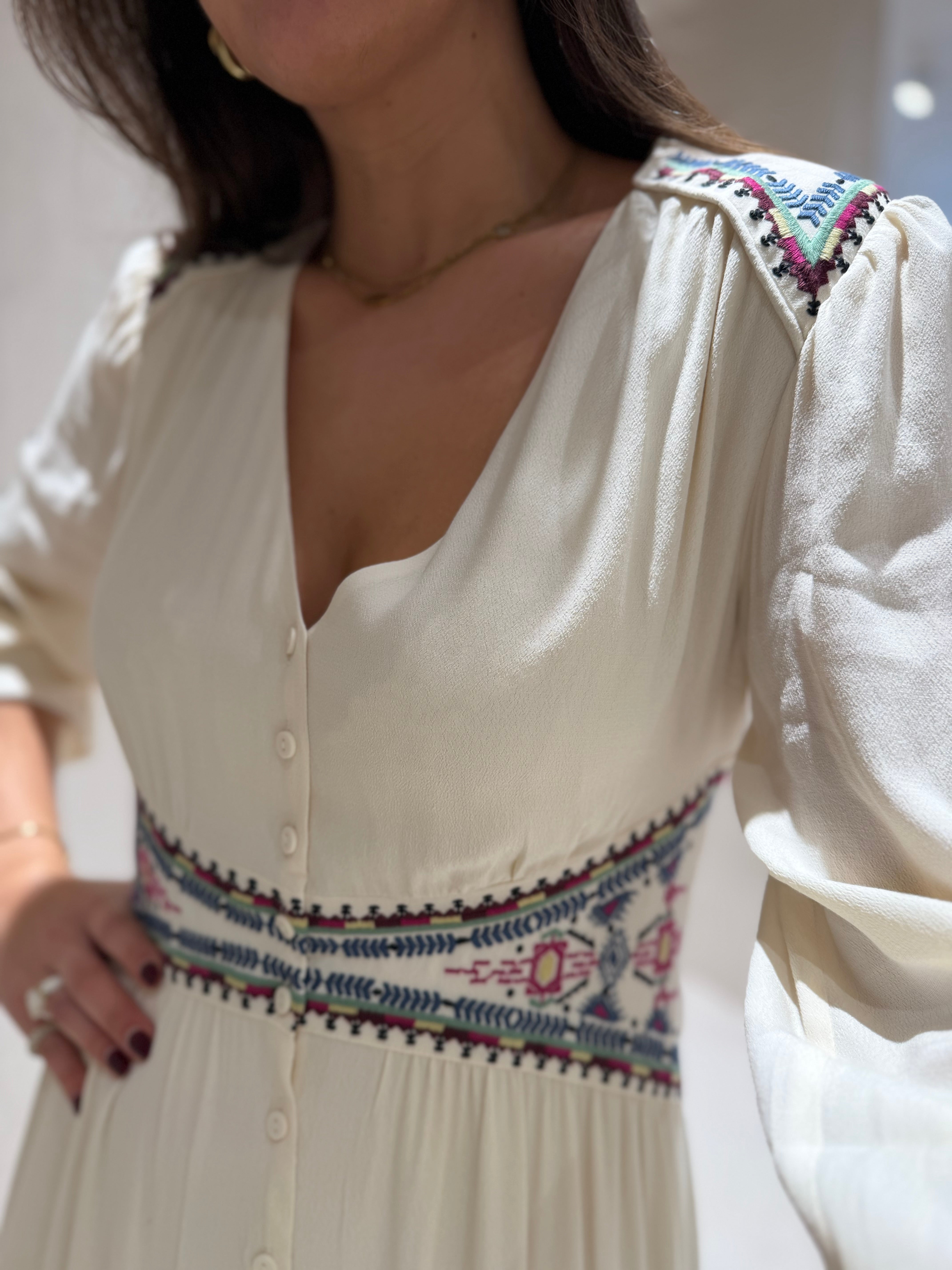 Vestido midi da Ba&sh em tom cru, com corte fluido e inspiração boémia. Apresenta decote em V com botões frontais e detalhes bordados contrastantes na cintura e nos ombros, que acrescentam um toque artesanal e feminino à peça.