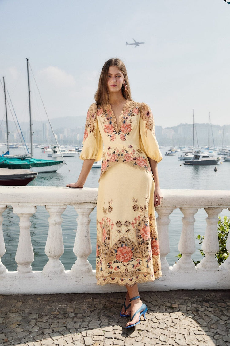 Descubra o encanto do vestido midi bordado de manga comprida da FARM Rio: uma peça que combina elegância artesanal com uma atitude confiante e cheia de personalidade. Este vestido em tom butter-gelb suave traz bordados delicados que criam um efeito visual rico e detalhado, perfeito para mulheres que adoram imprimir estilo único em qualquer ocasião.