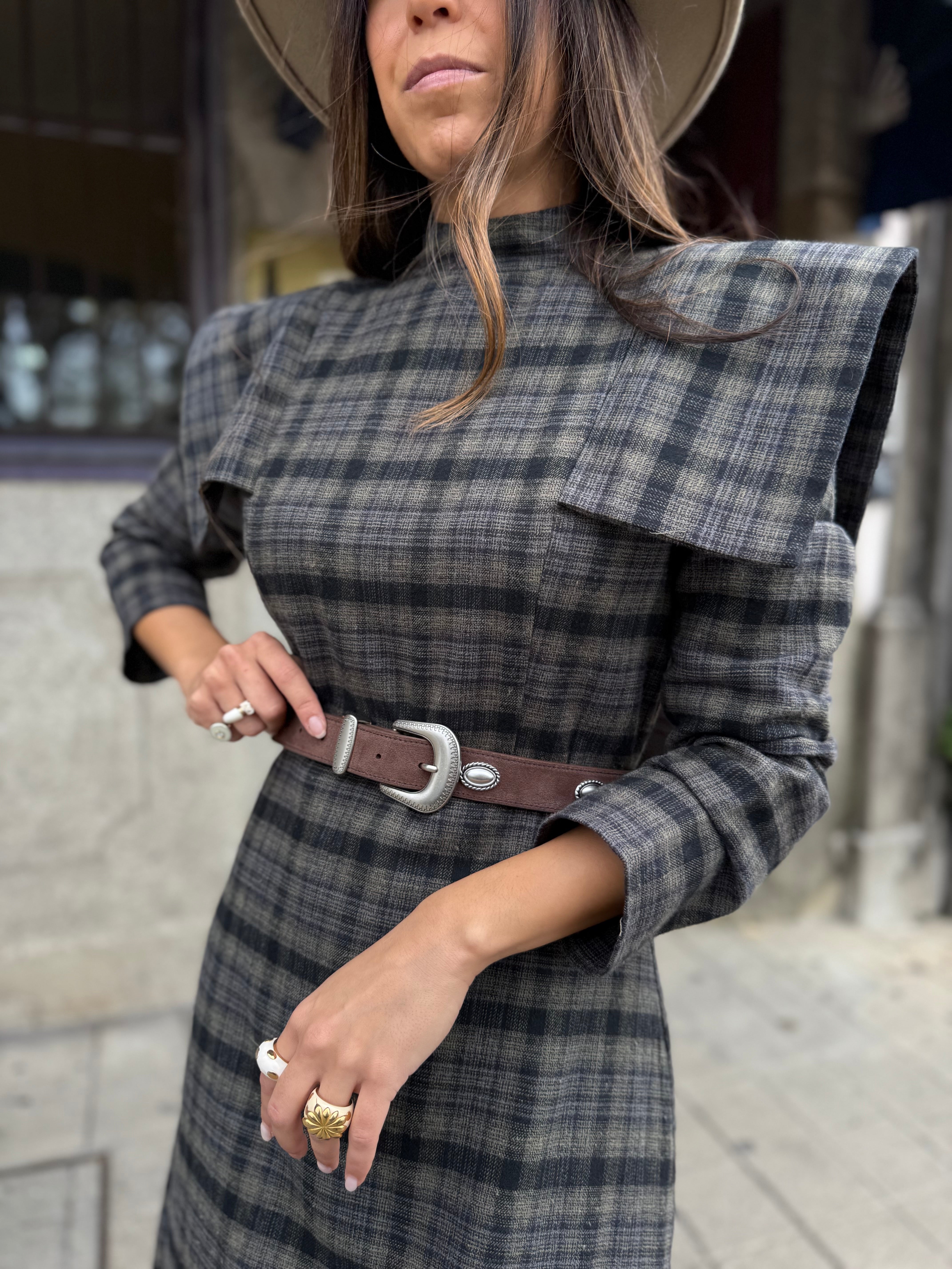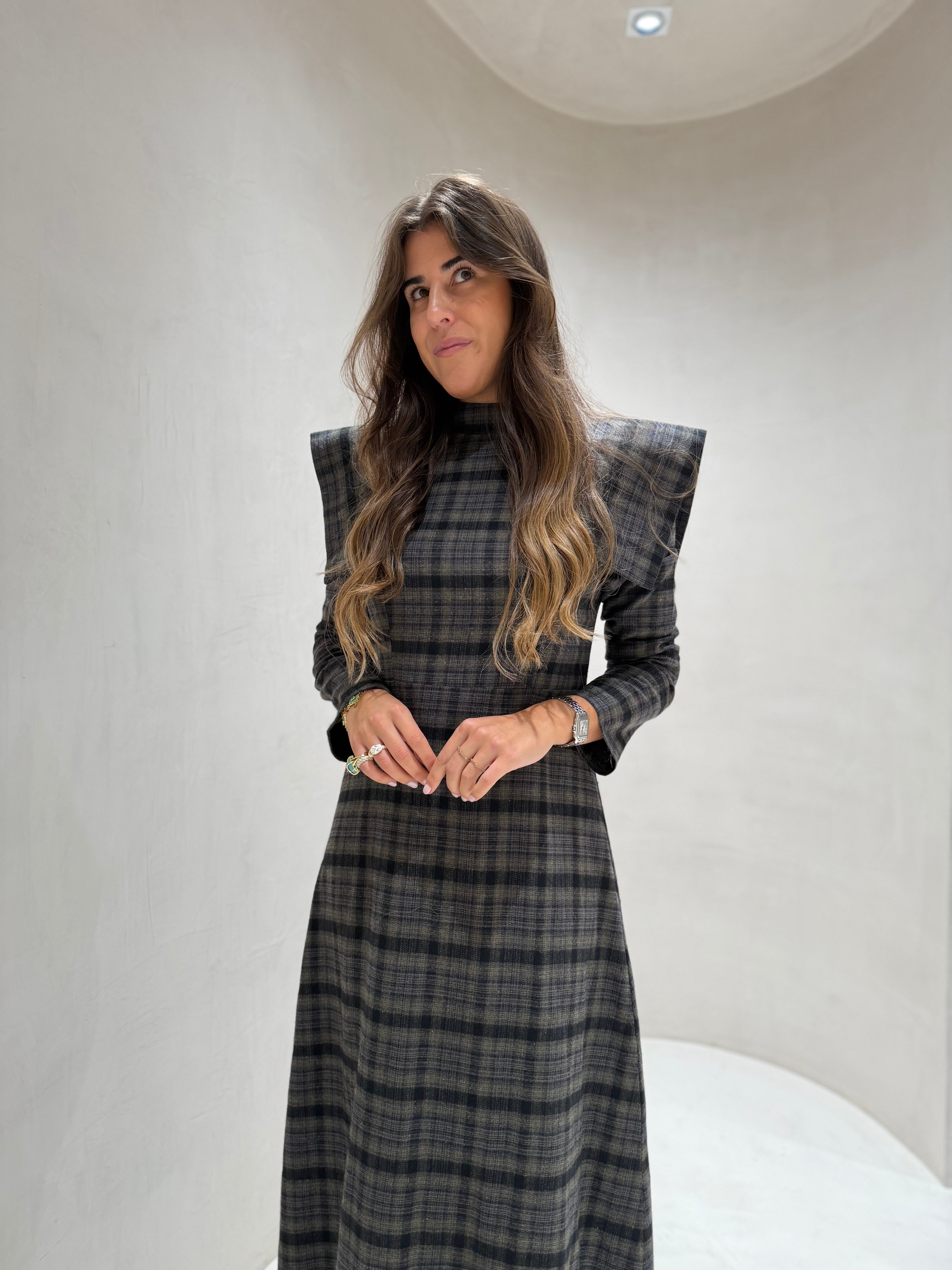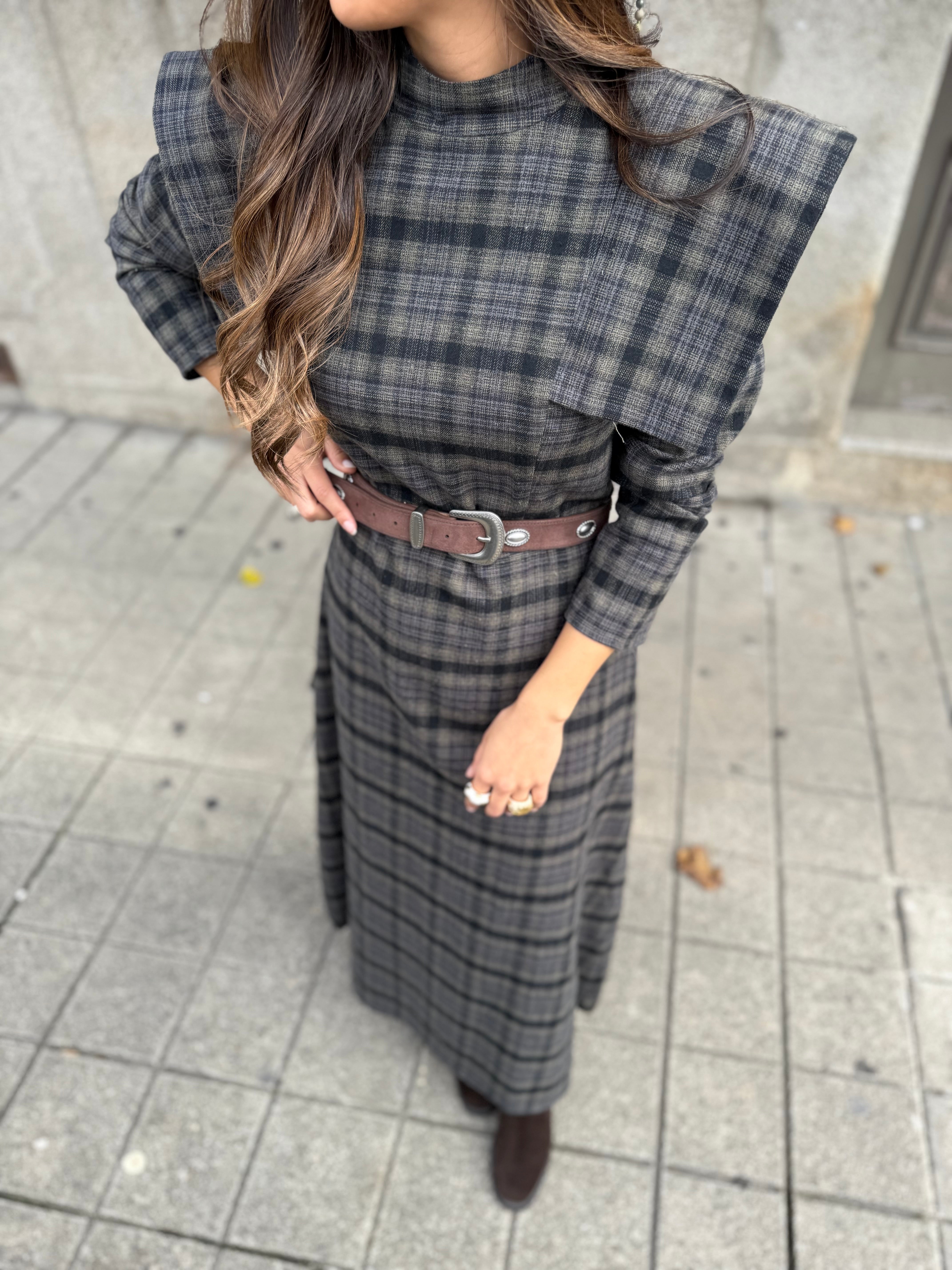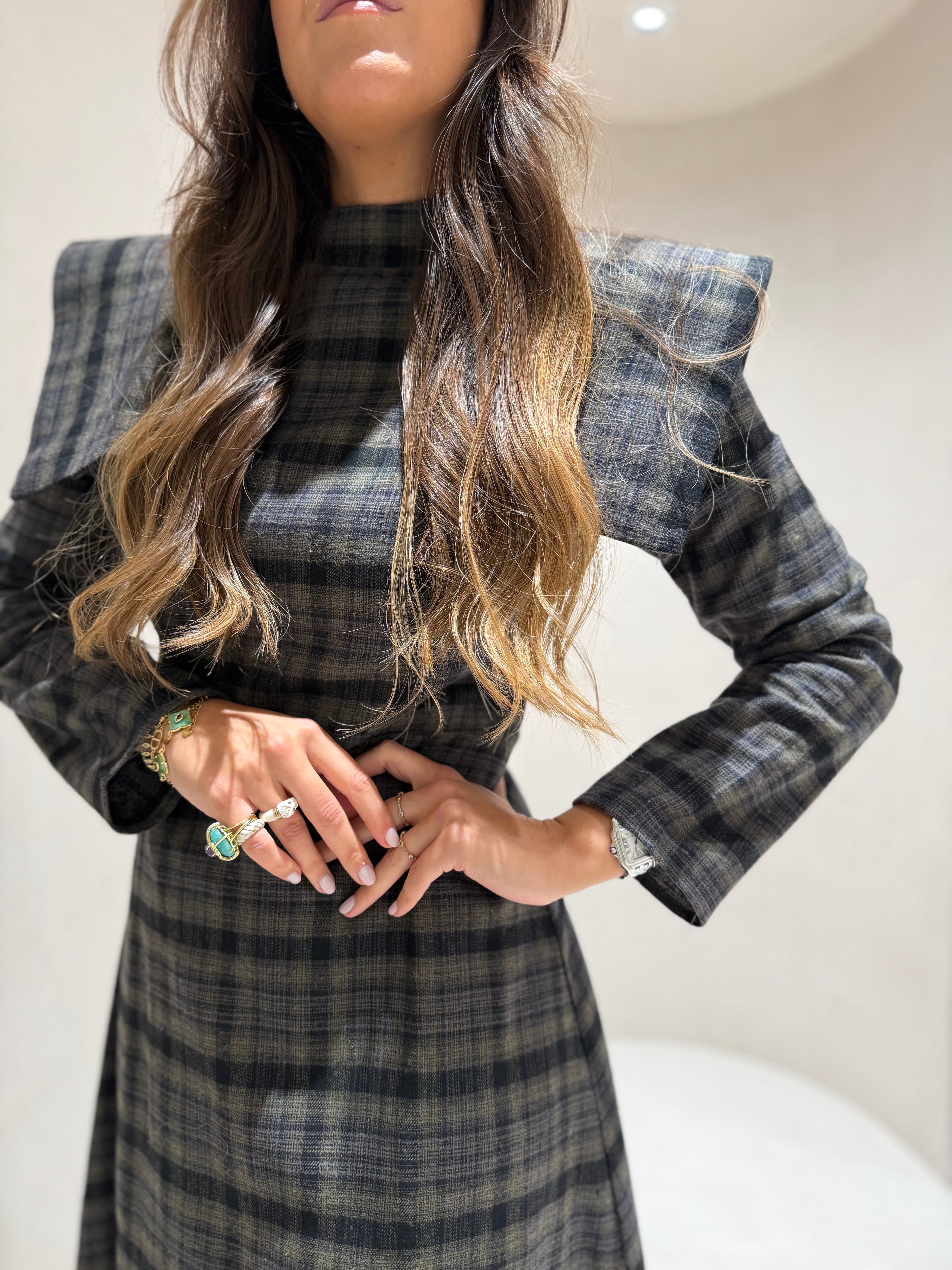 Sofisticação e personalidade em cada detalhe. Este vestido midi de padrão xadrez combina o charme clássico do xadrez com o toque ousado das ombreiras estruturadas, que valorizam a silhueta com elegância e confiança.