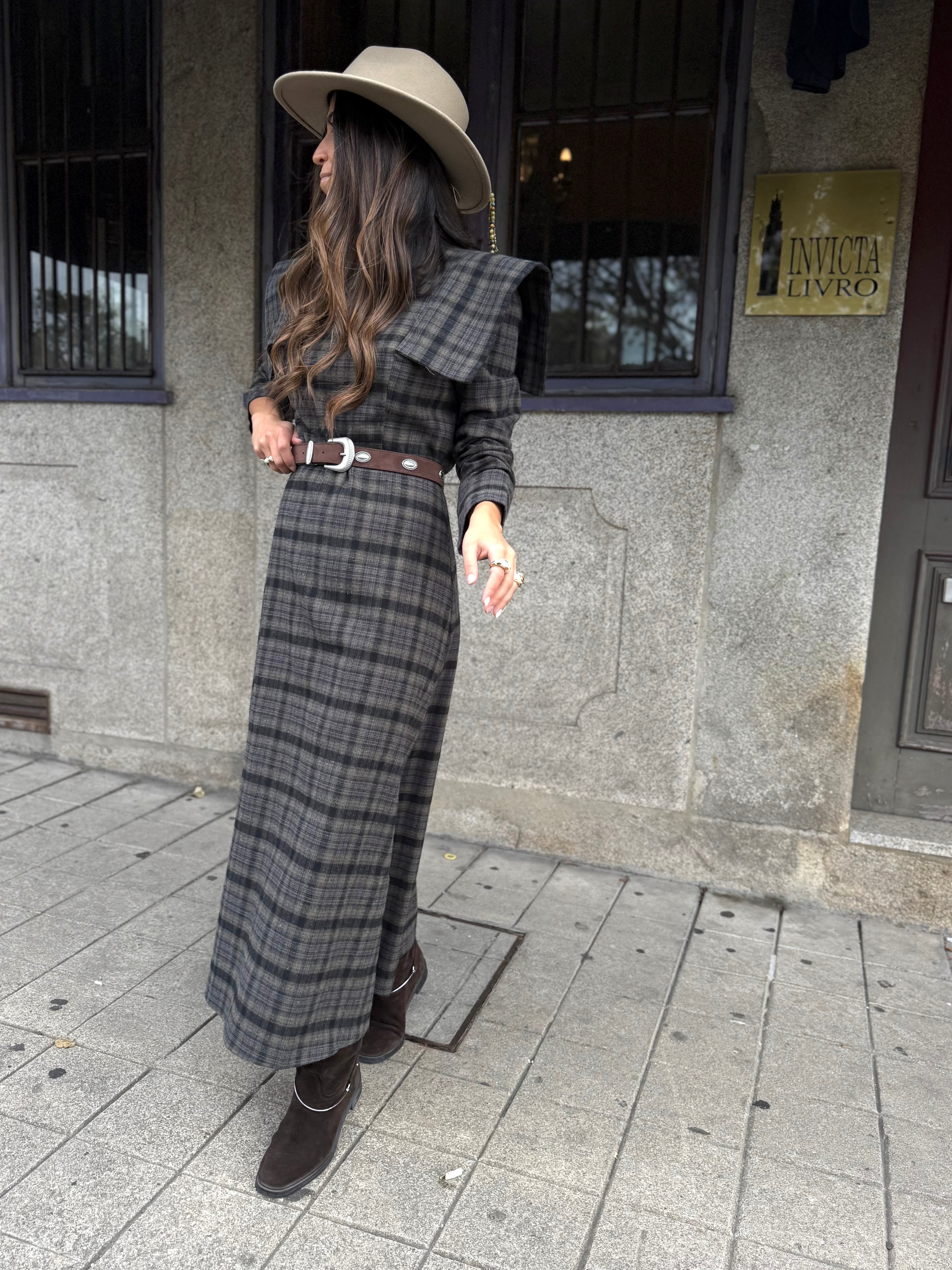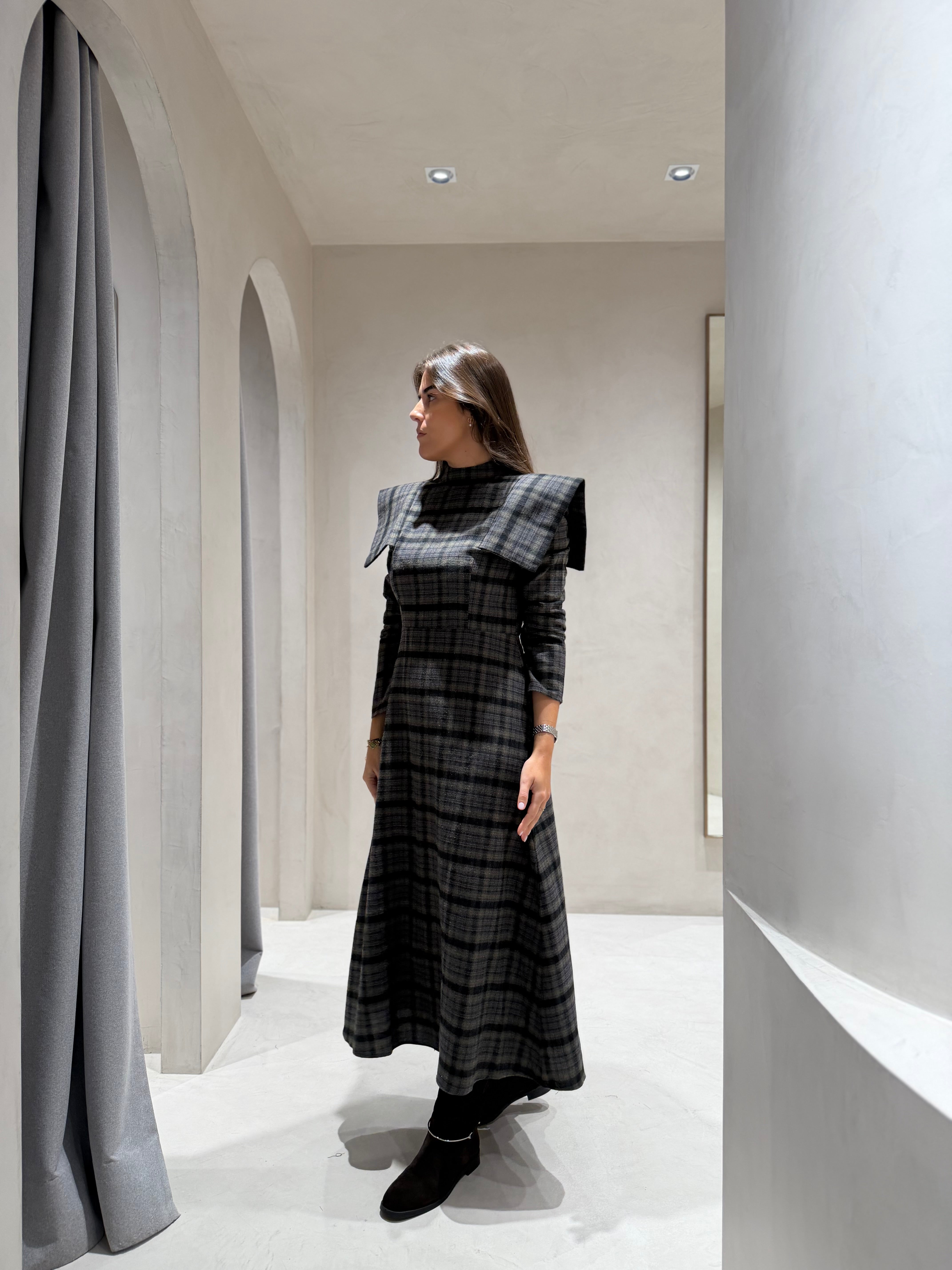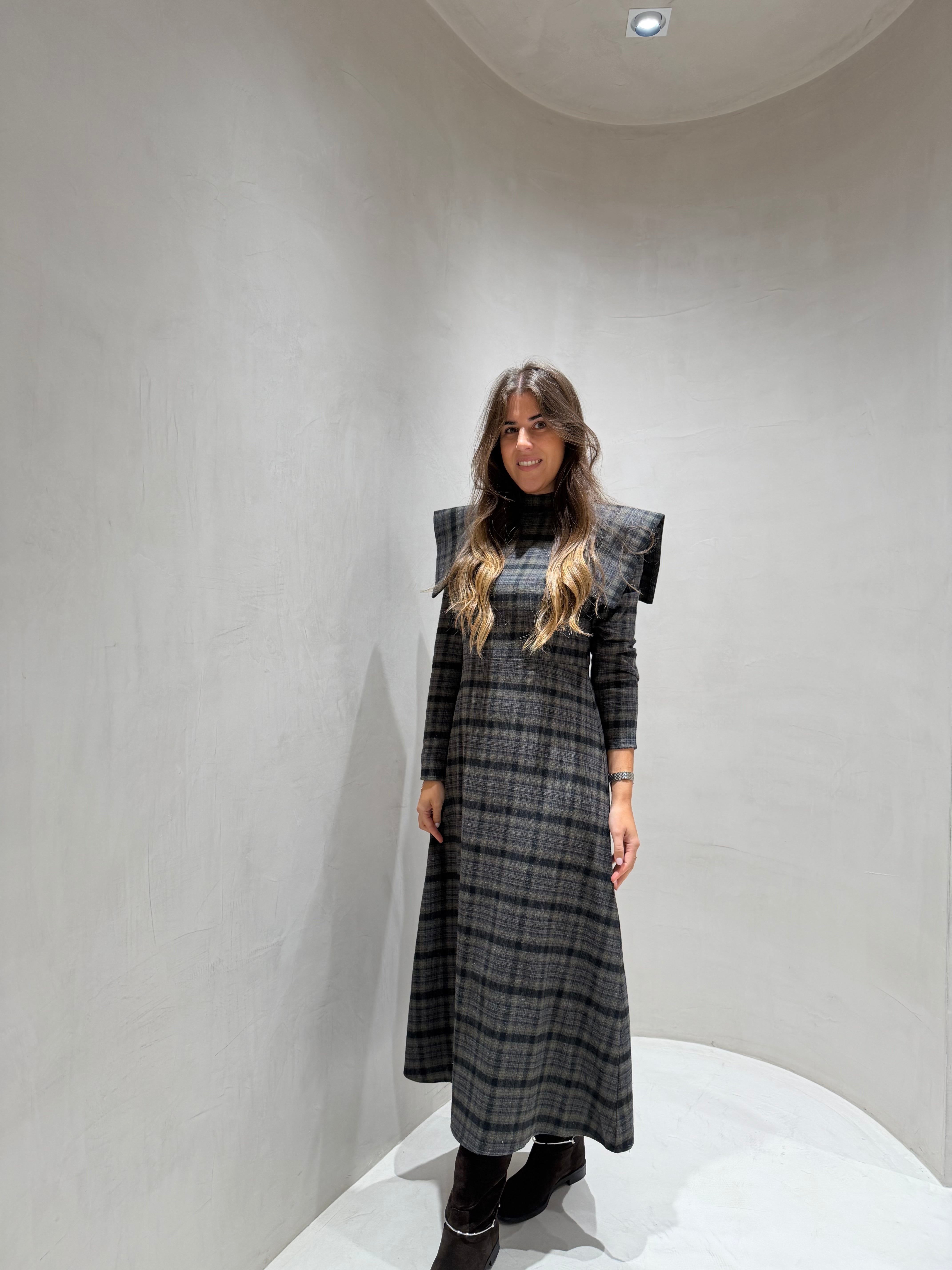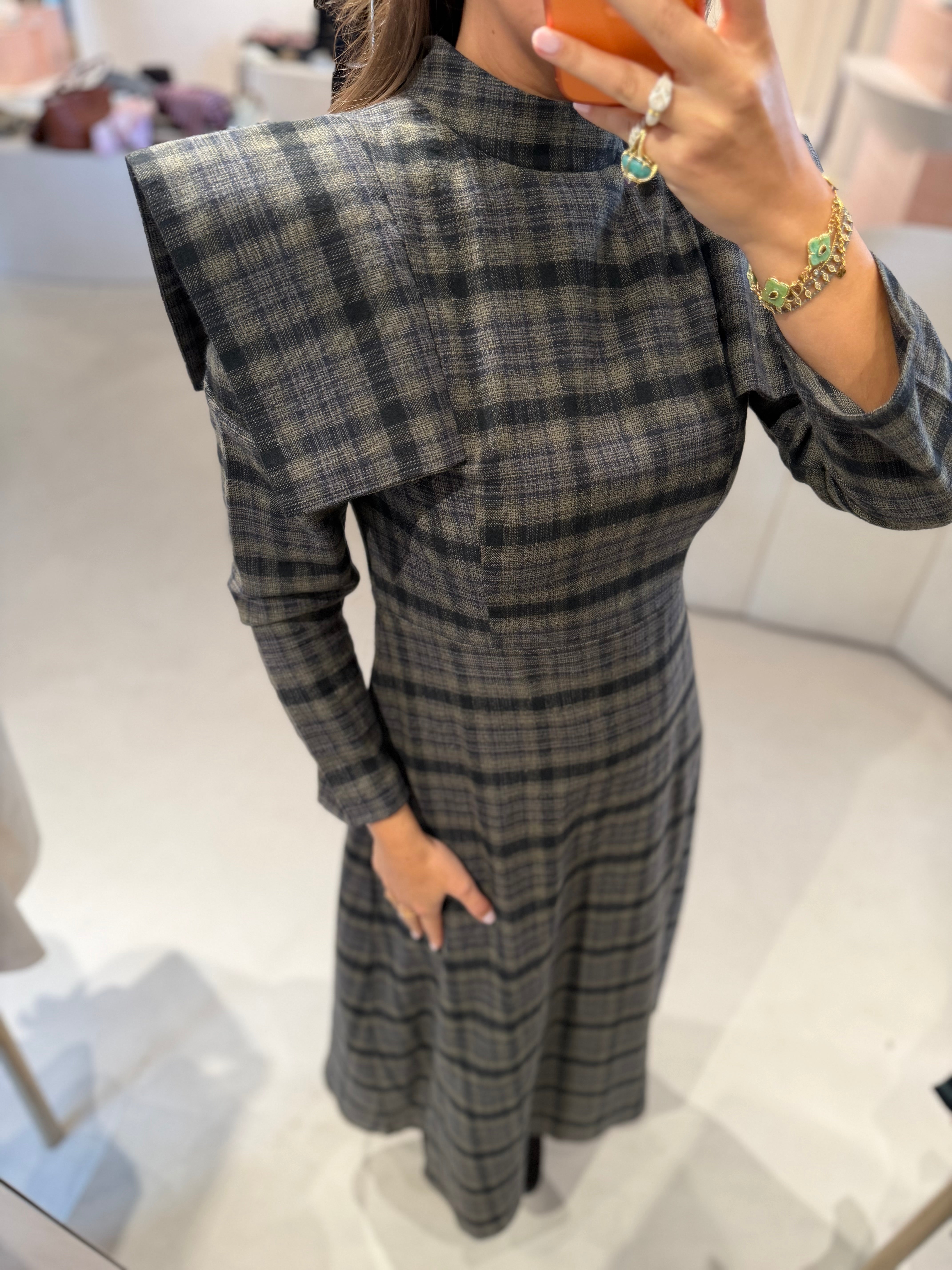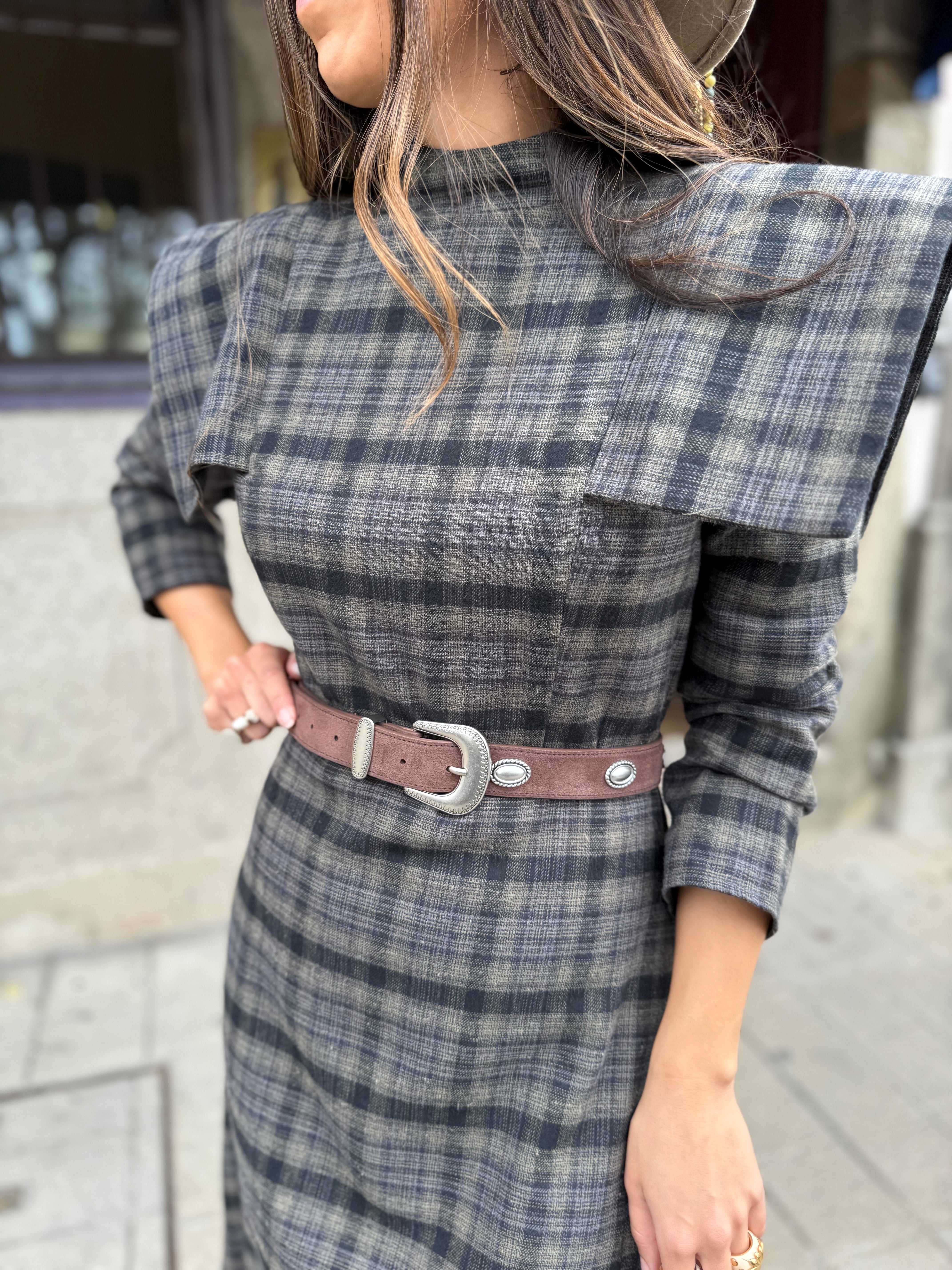 Sofisticação e personalidade em cada detalhe. Este vestido midi de padrão xadrez combina o charme clássico do xadrez com o toque ousado das ombreiras estruturadas, que valorizam a silhueta com elegância e confiança.