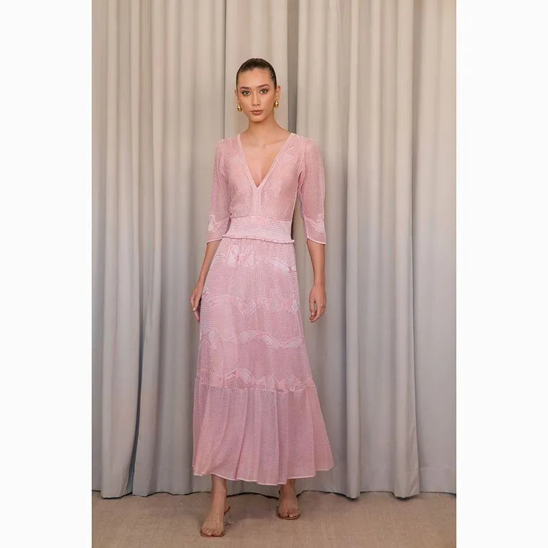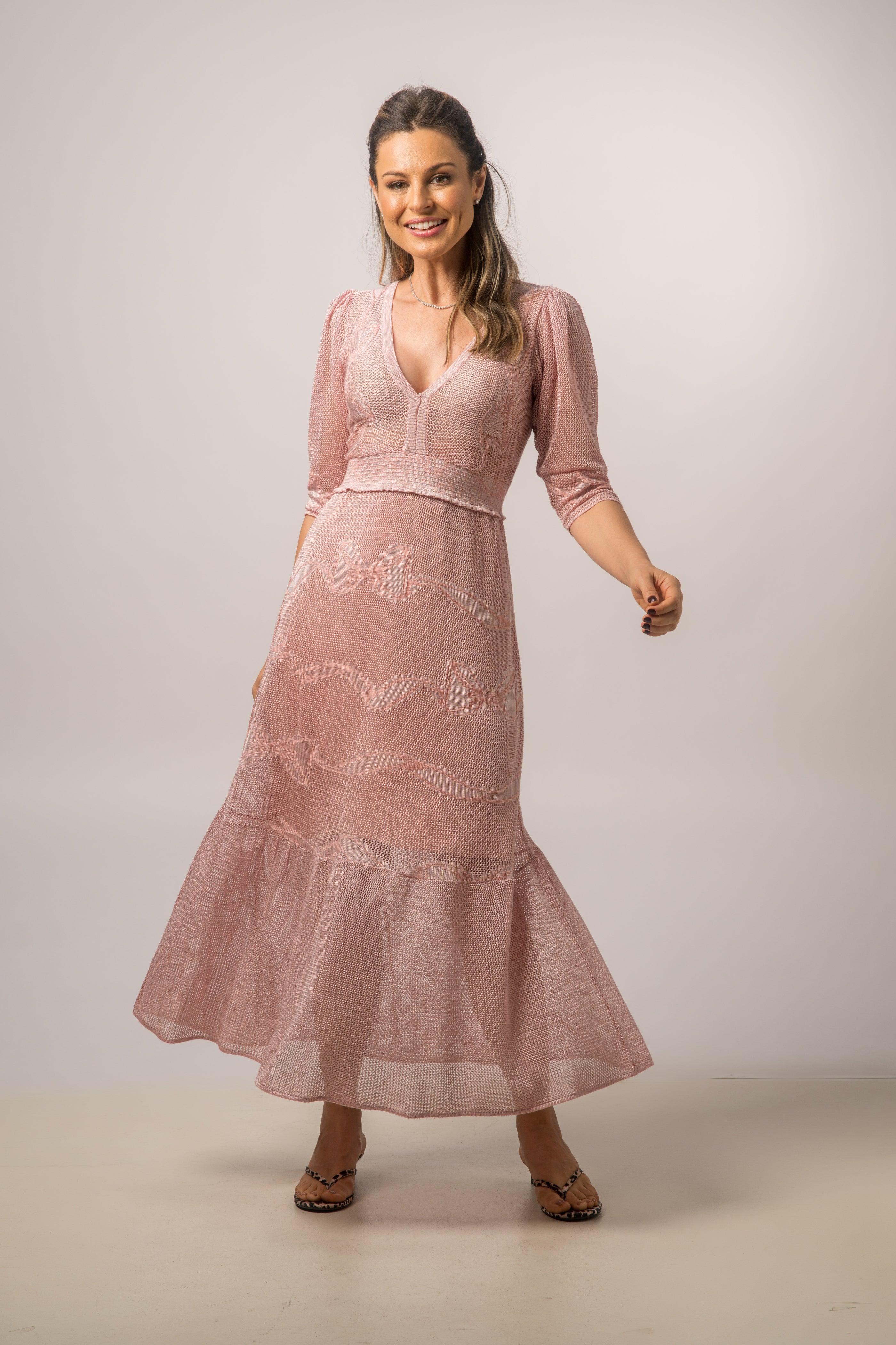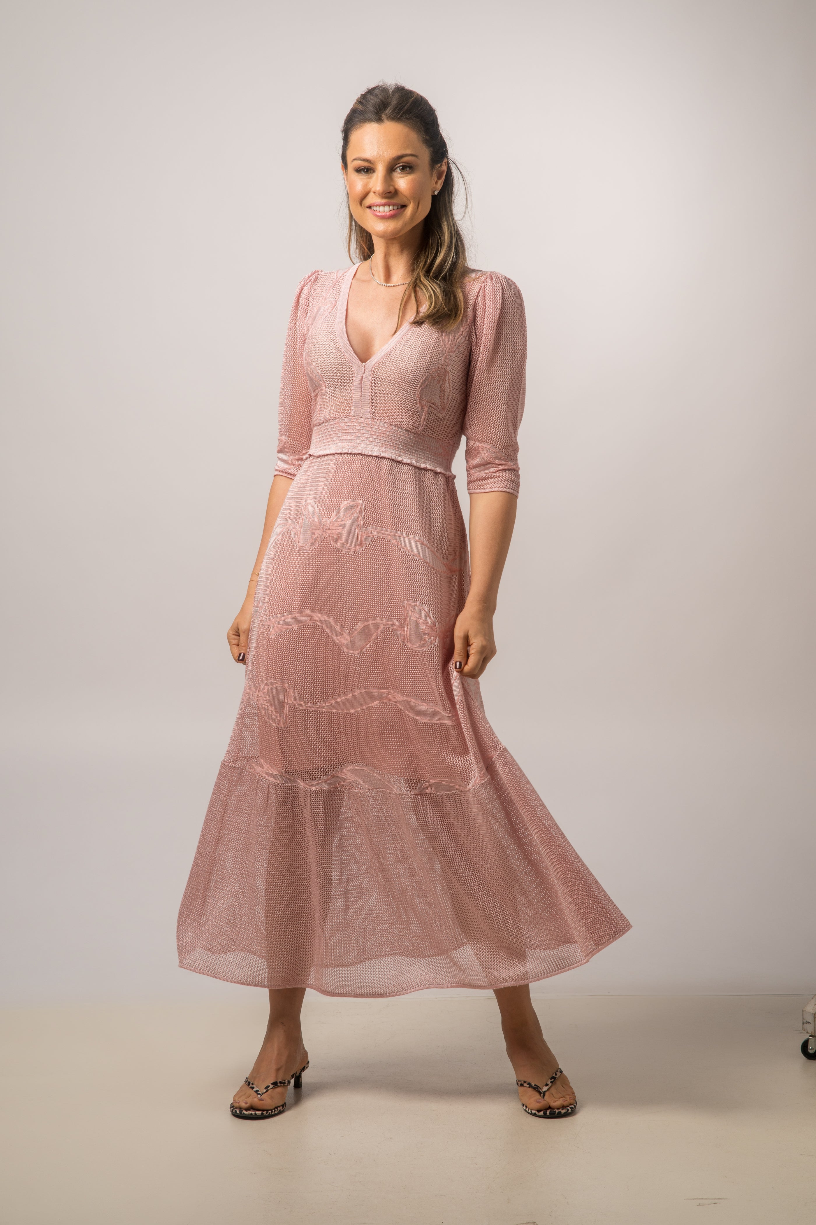Vestido midi Cecilia Prado em malha tricotada rosa, decote em V, manga 3/4, elástico na cinta e saia com folho.