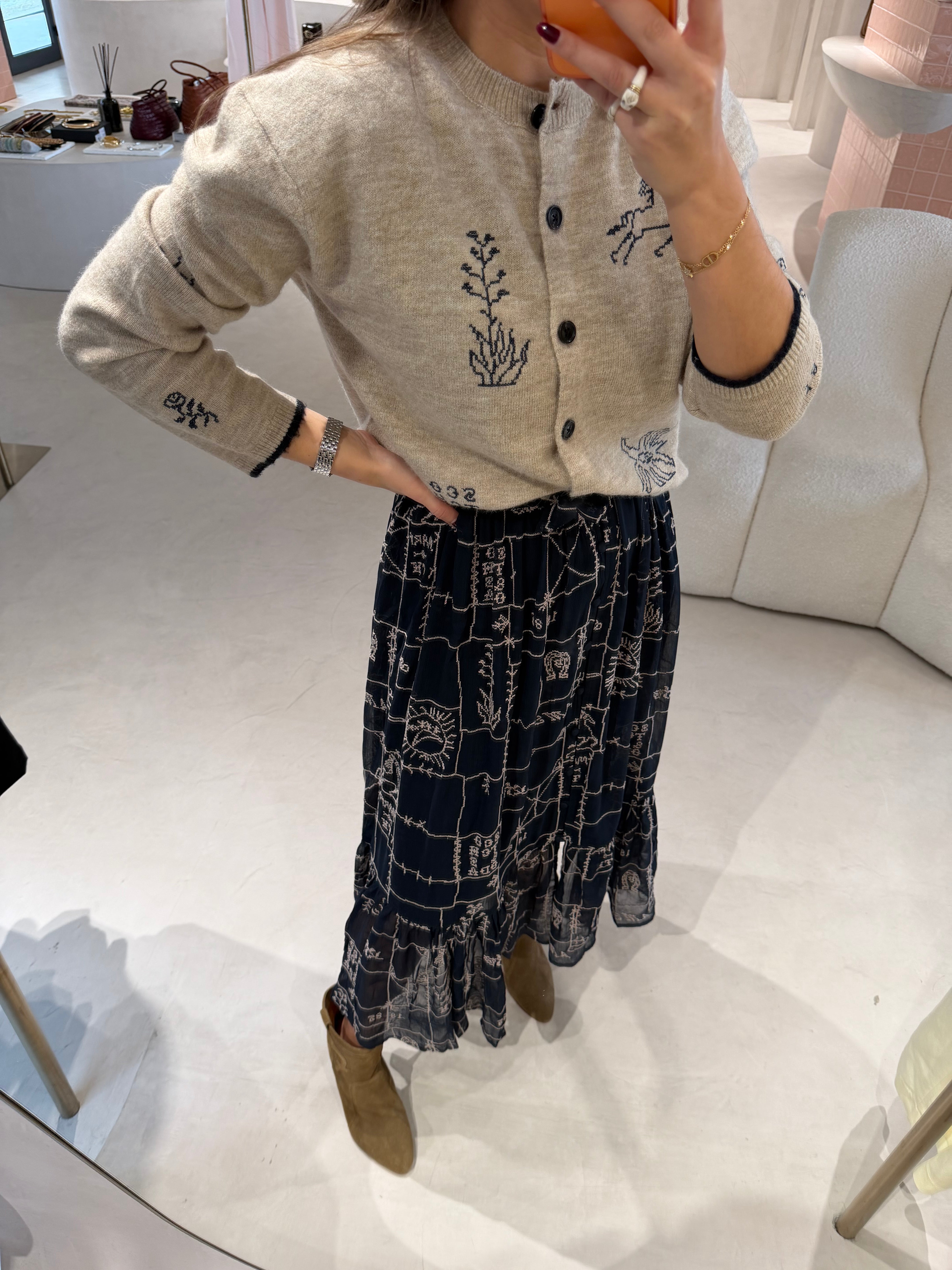O vestido da Scotch & Soda é um vestido midi estampado com delicados bordados ao ponto cruz, que combina o espírito boémio da marca com um design moderno e fluido. Ideal para quem procura uma peça versátil e feminina, que se adapta desde looks de dia descontraídos até outfits mais sofisticados para eventos ou jantares.