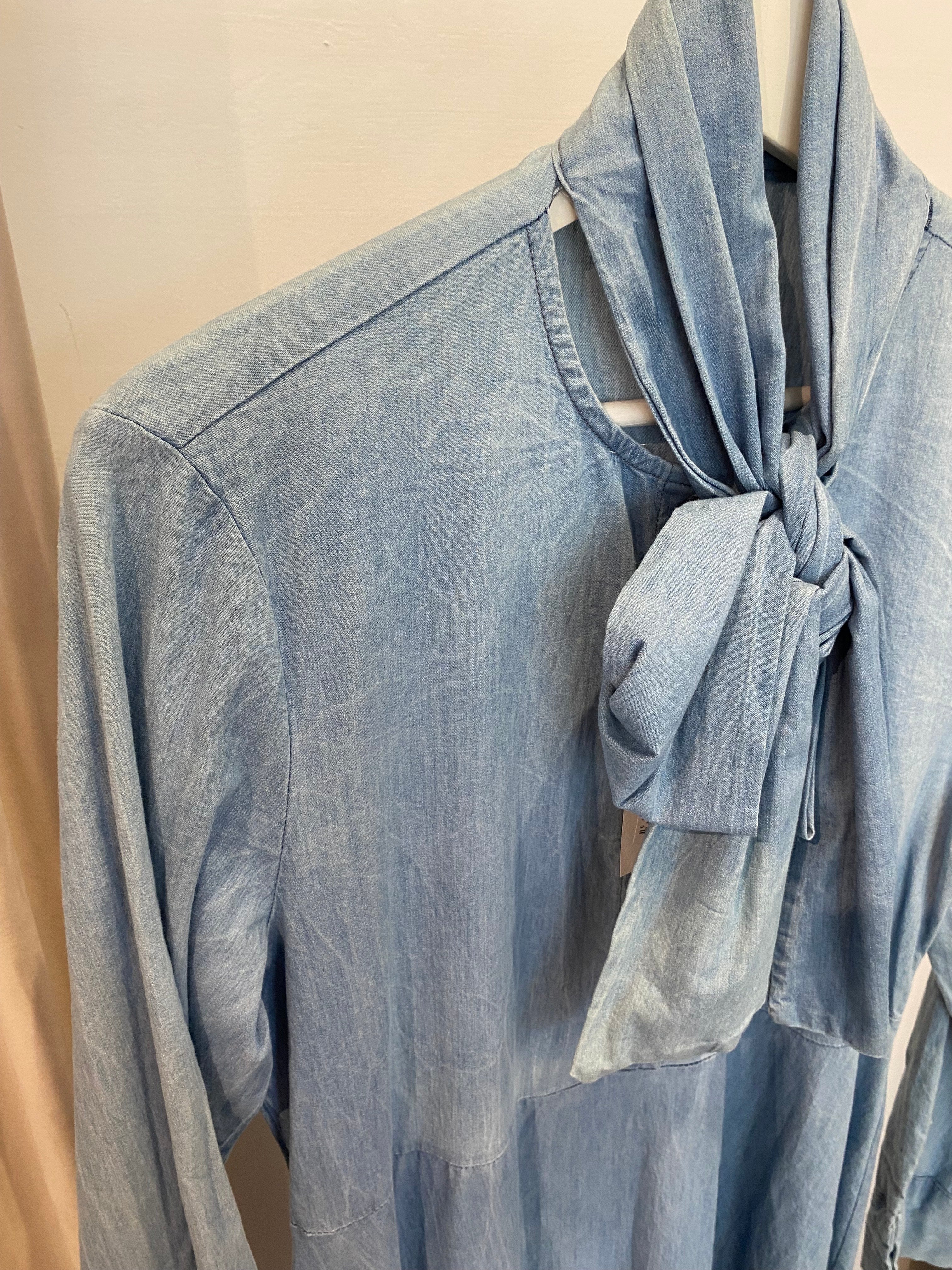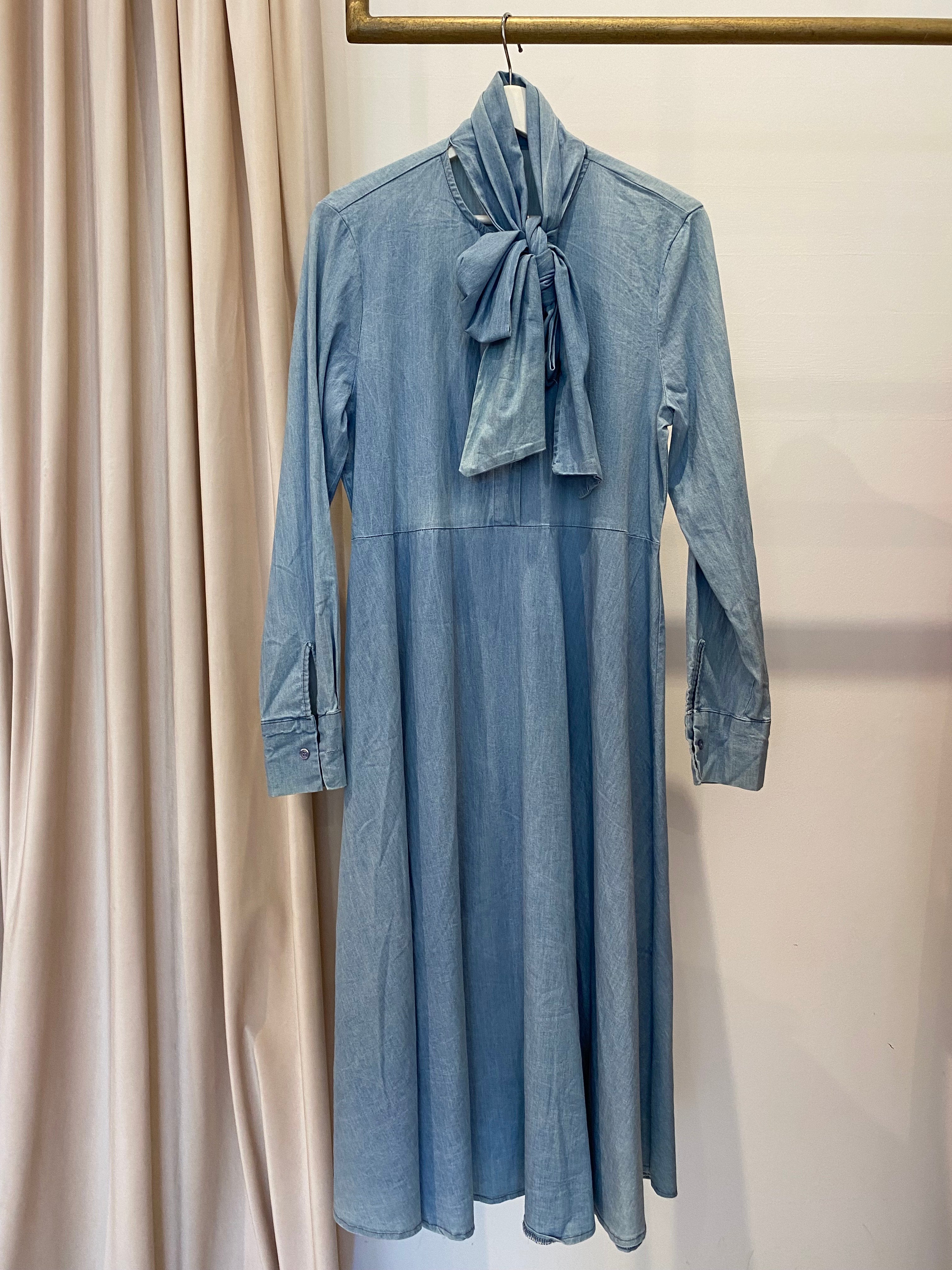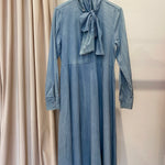 Vestido Midi Jeans com Gola em Laço, punho com botão.