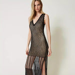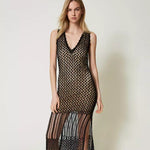 Vestido midi Twinset preto em malha tricotada com pérolas costuradas à mão, corte reto, bordas recortadas, decote em V e combinação em bege.