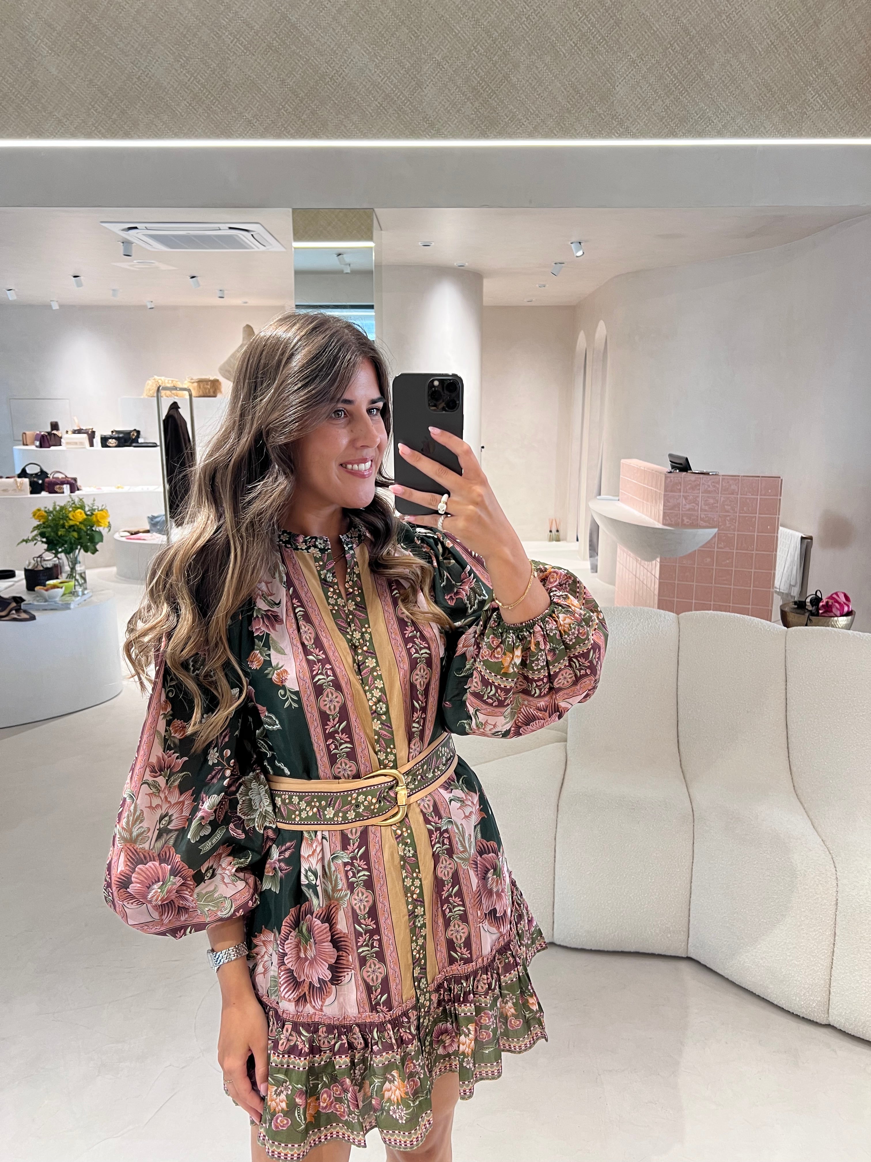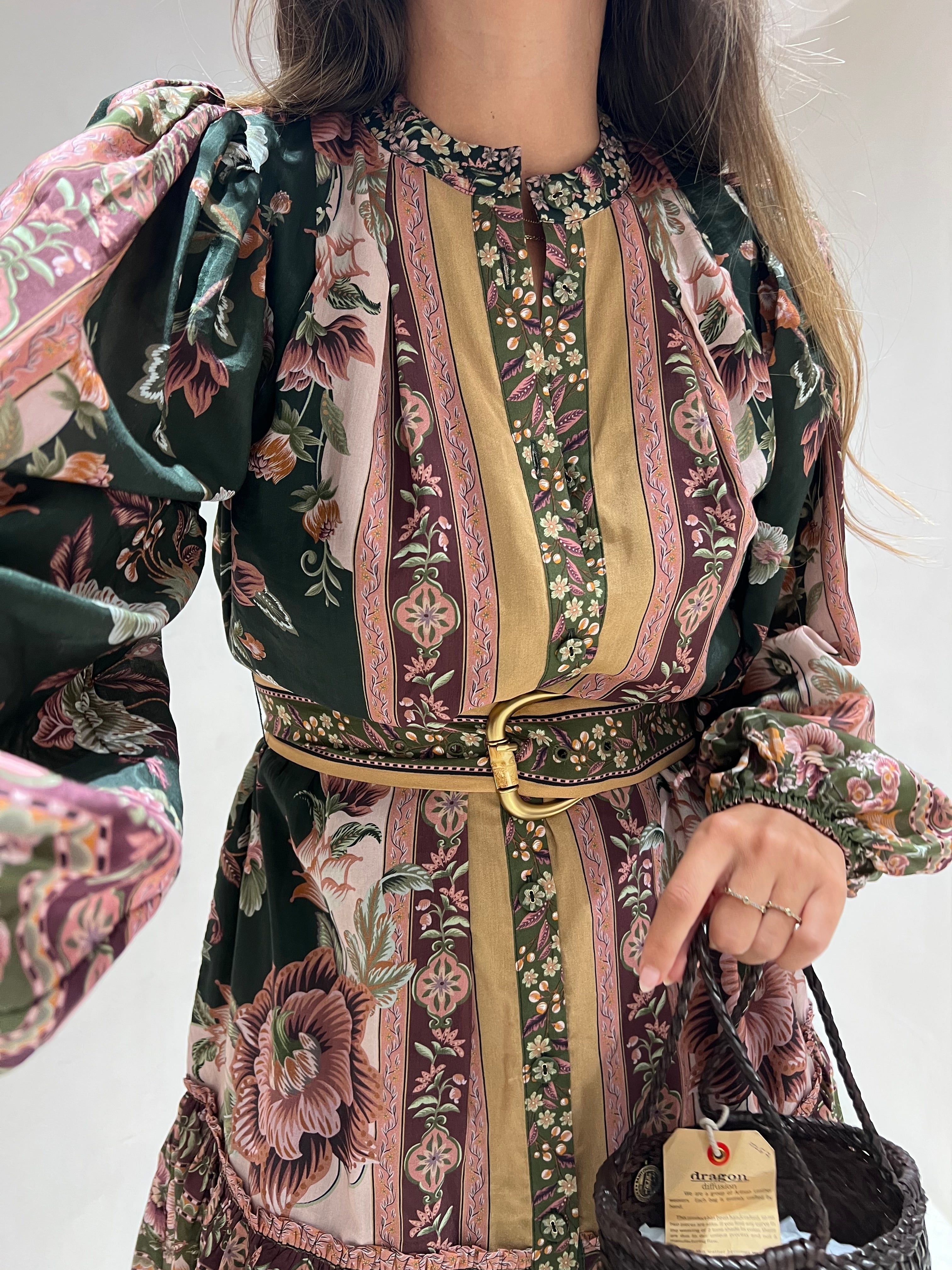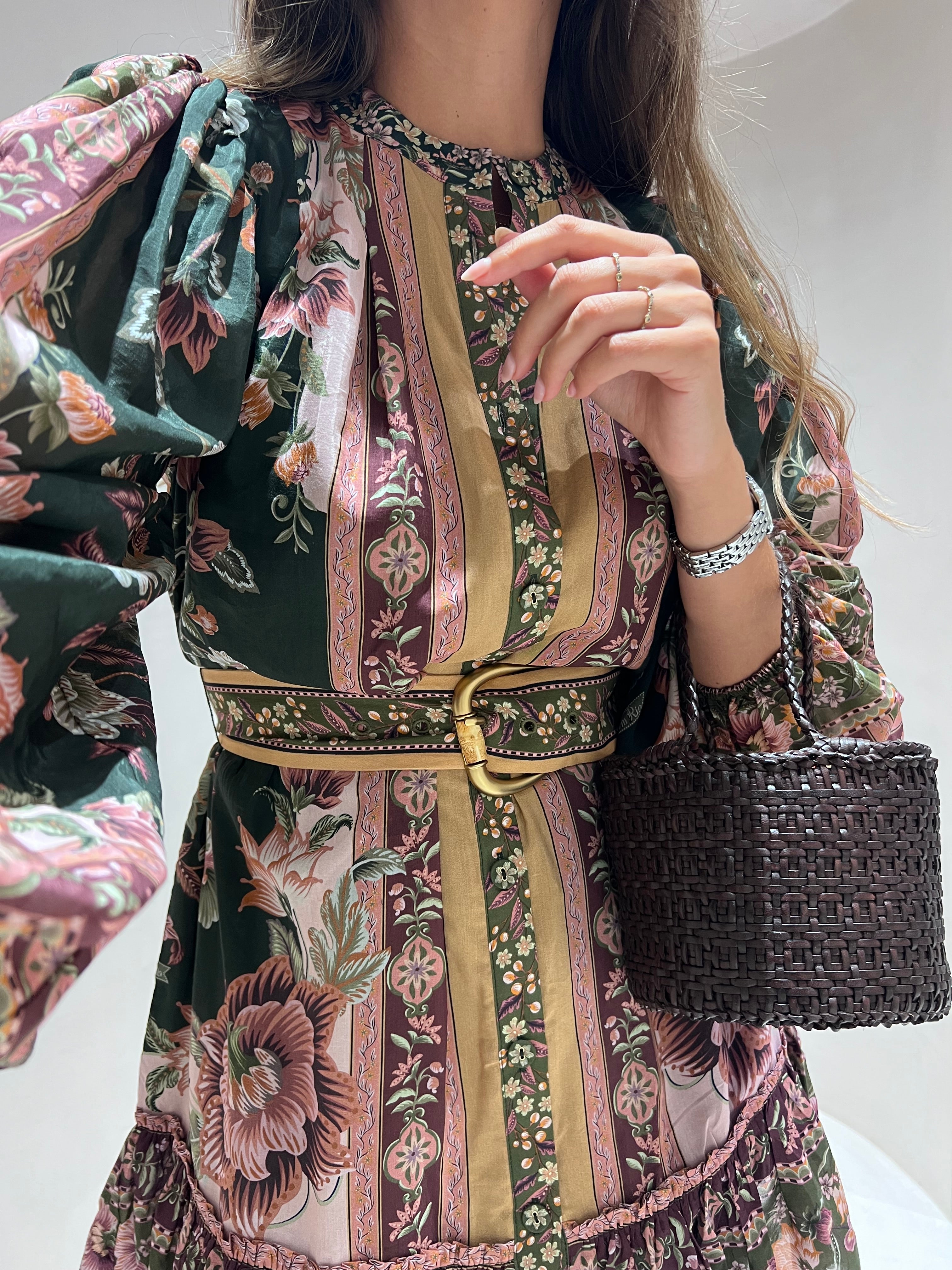 O Flowering Garden Tree Green Mini Dress da FARM Rio transporta-te para um jardim encantado com o seu padrão floral vibrante em verde profundo e rosa suave. O design revela-se sofisticado e feminino, com gola alta estruturada e mangas bufantes imponentes que lhe conferem charme e personalidade. A cintura franzida, realçada por um cinto do mesmo tecido, cria uma silhueta favorecedora, enquanto o folho delicado na bainha acrescenta fluidez e movimento à peça. Ideal para brilhar tanto em jardins soalheiros como numa aventura urbana vibrante.