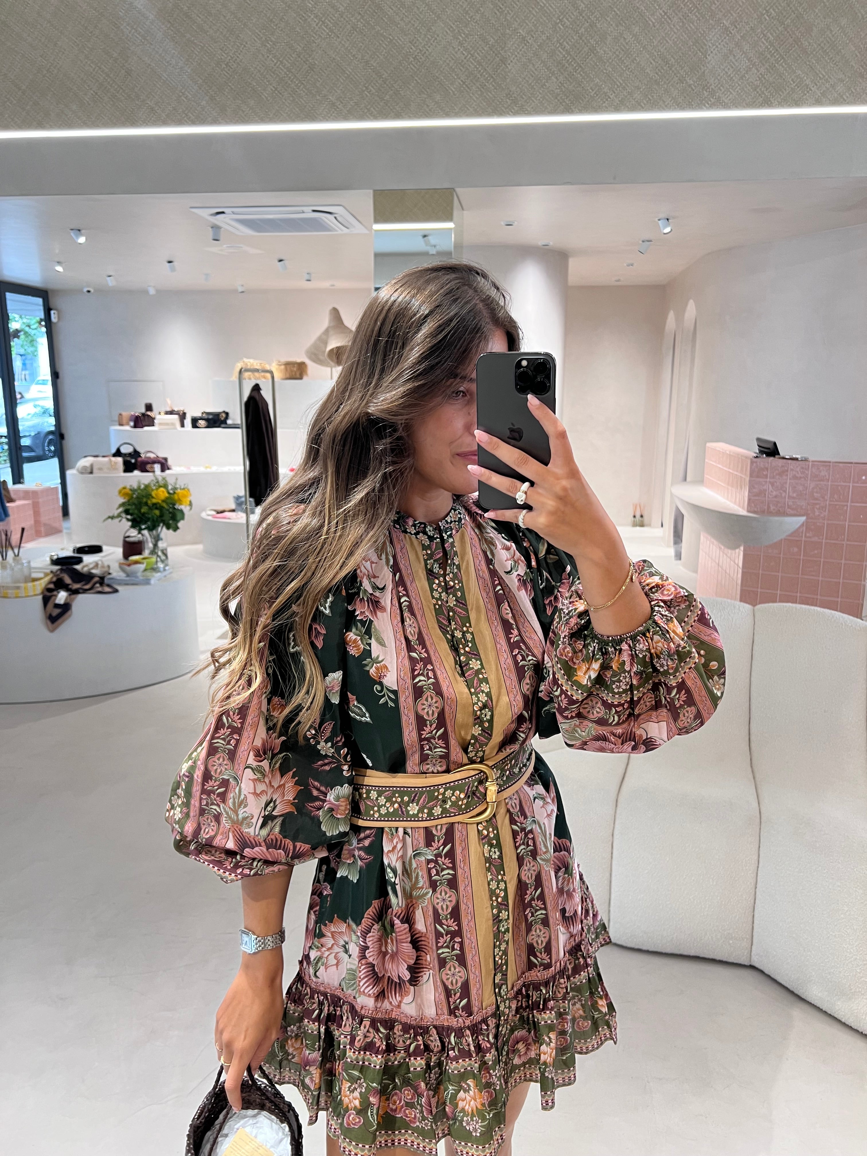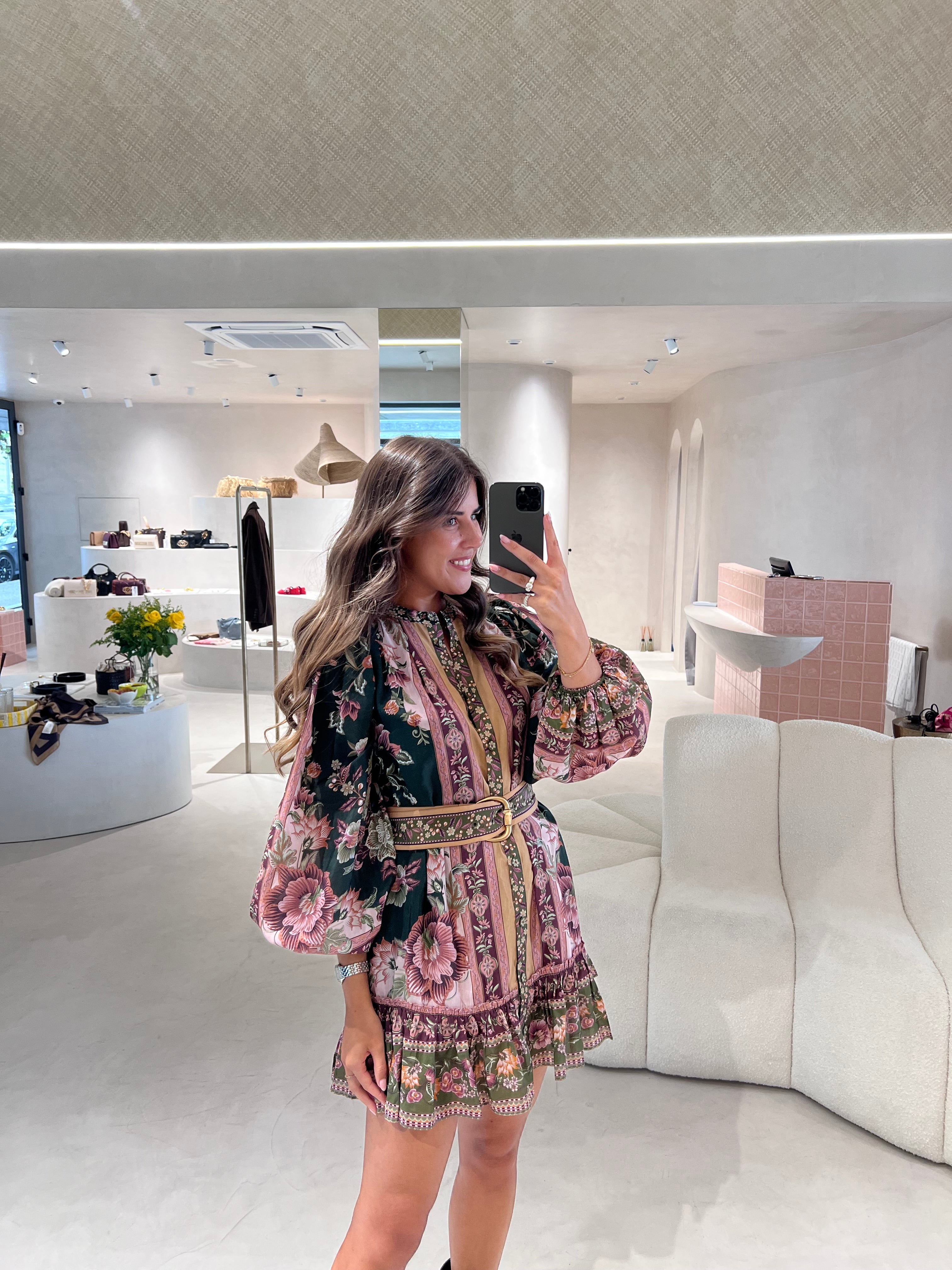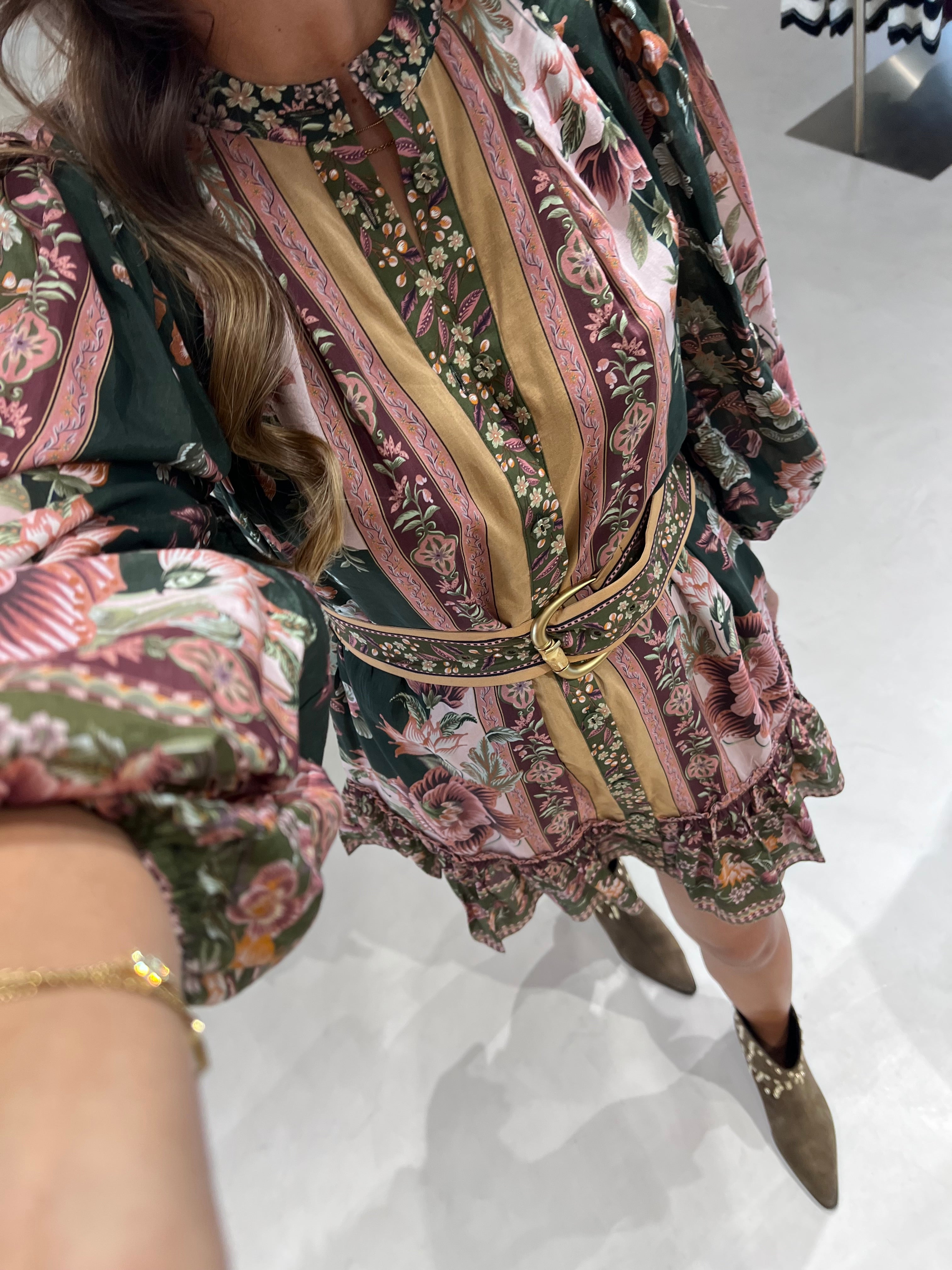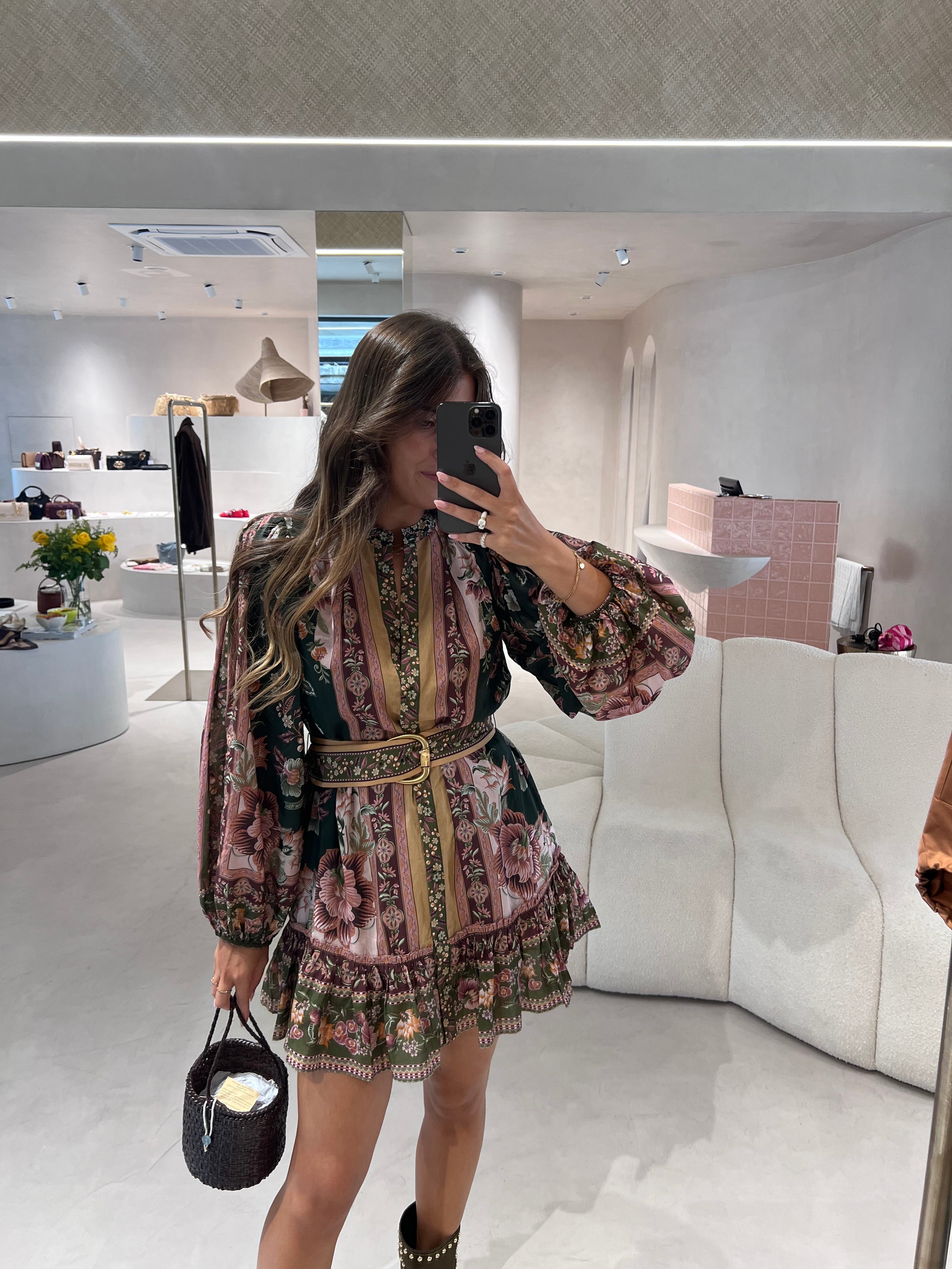 O Flowering Garden Tree Green Mini Dress da FARM Rio transporta-te para um jardim encantado com o seu padrão floral vibrante em verde profundo e rosa suave. O design revela-se sofisticado e feminino, com gola alta estruturada e mangas bufantes imponentes que lhe conferem charme e personalidade. A cintura franzida, realçada por um cinto do mesmo tecido, cria uma silhueta favorecedora, enquanto o folho delicado na bainha acrescenta fluidez e movimento à peça. Ideal para brilhar tanto em jardins soalheiros como numa aventura urbana vibrante.